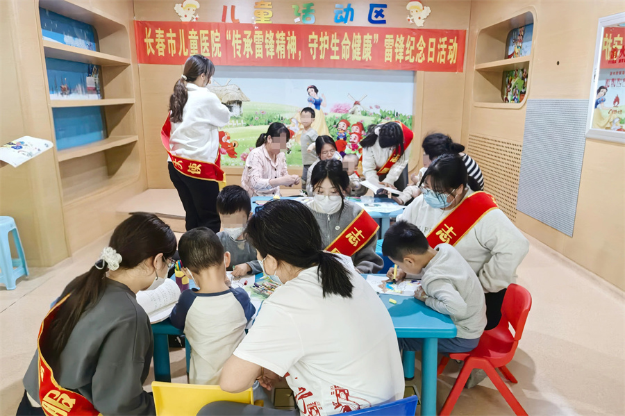 当日下午,“传承雷锋精神,守护生命健康”主题活动在消化二科和神经内科疗区举行。来自长春师范大学和吉林外国语大学的“暖童”志愿者在消化二科为住院的小朋友们讲述雷锋的故事,带领他们发挥想象,画出自己心中雷锋的模样。