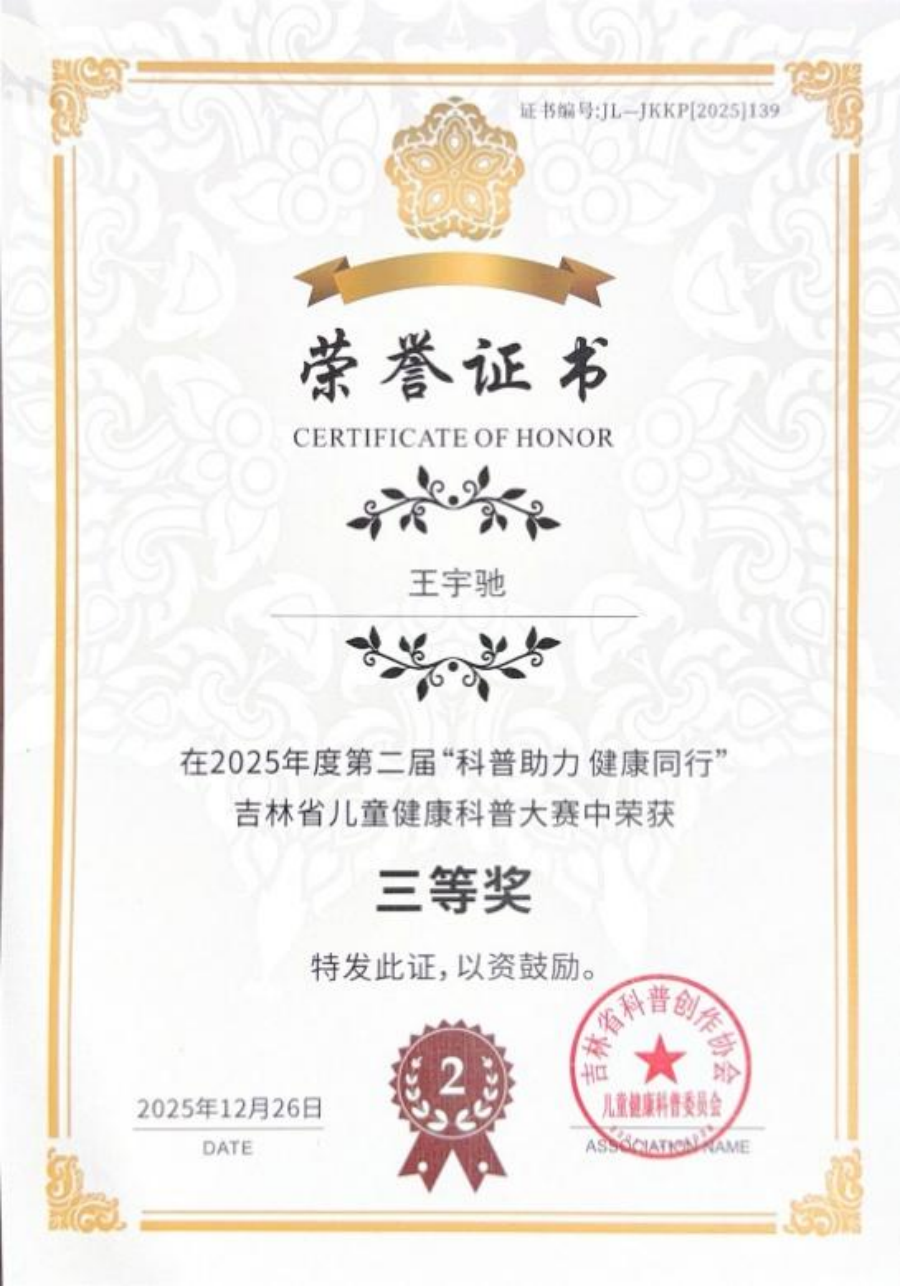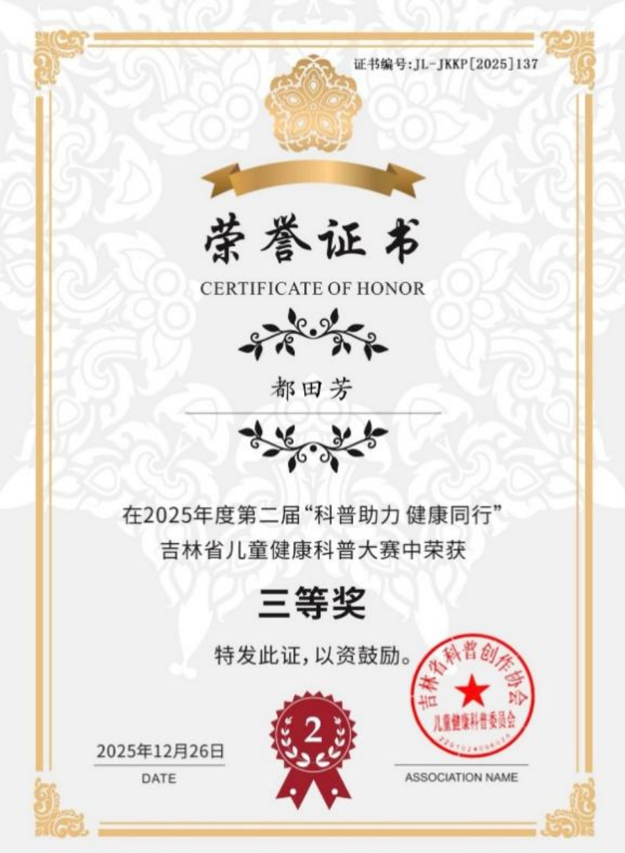 2025年12月26日,由吉林省儿童健康科普委员会主办的“科普助力、健康童行”第二届吉林省儿童健康科普大赛总决赛在长春圆满结束。北京儿童医院集团医院·a片网站 参赛选手都田芳、王宇驰均获得图文类三等奖。