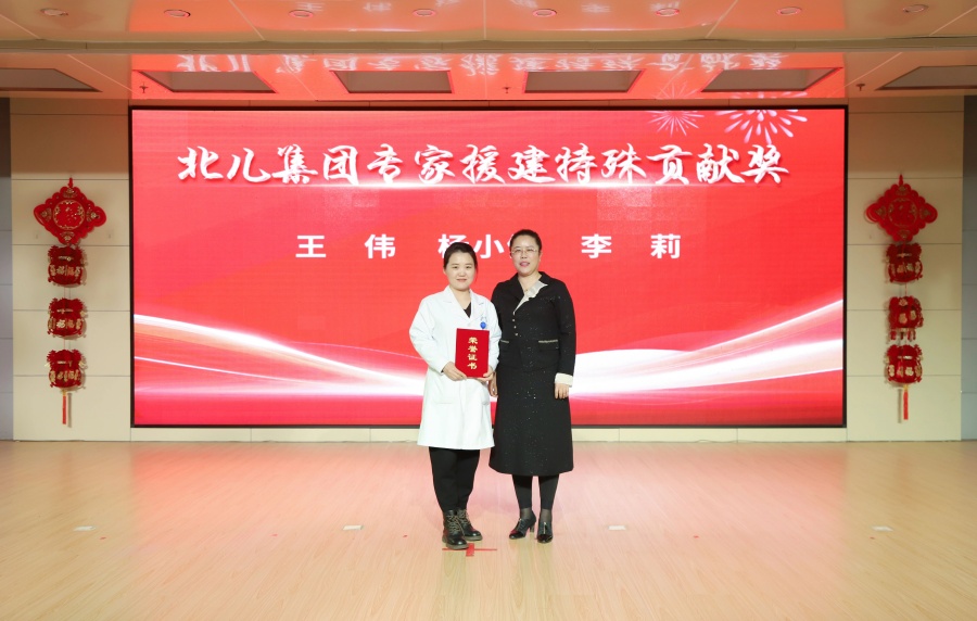 ▲院领导为“北儿集团专家援建特殊贡献奖”获得者代表王伟颁奖!