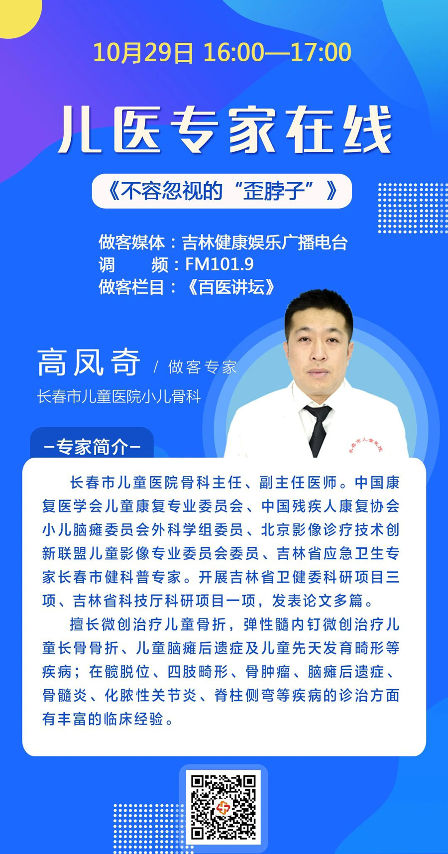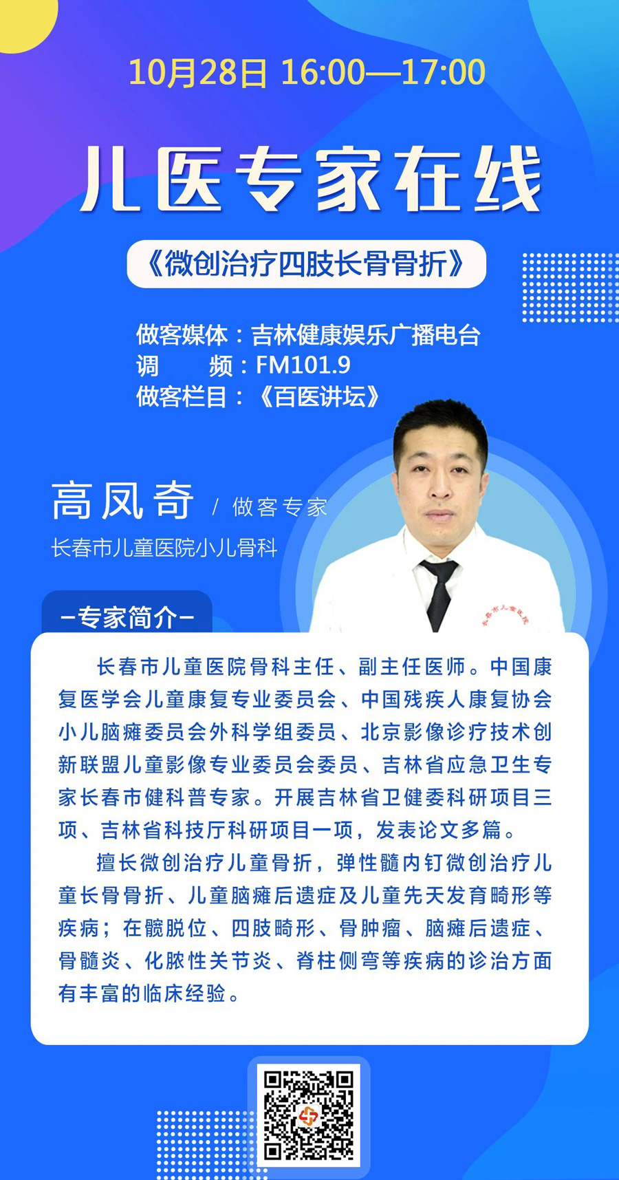 10月28日、29日,a片网站 骨科主任高凤奇将做客吉林健康娱乐广播电台《百医讲坛》,为家长传递骨科知识。微创治疗四肢长骨骨折、儿童“歪脖”就是肌性斜颈吗……这些家长常关注的骨科方面问题,高凤奇主任届时将一一为家长解答,期待您准时收听。