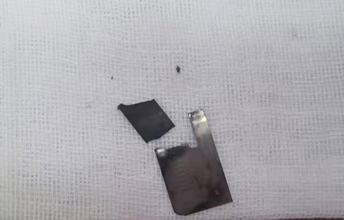 整个过程用时15分钟,取出2枚长度分别为2.5厘米和1.5厘米的刀片。这一刻,所有人悬着的心终于落地了。由于异物在女孩食道和胃部留存了3个多小时,食道黏膜略微糜烂,边鹏给予盐水冲洗处理。