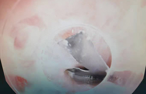 手术前,边鹏对异物的情况进行了充分研判,考虑到刀片的锋利性,摘取过程中如稍有不慎,就可能划伤食道,造成二次损伤。边鹏在异物钳前端加了一个透明帽,以保护食道。当食道处的刀片被顺利取出后,边鹏又将内镜探入女孩胃部,继续寻找异物。由于胃内存有不少食物,镜下探寻难度极大。期间,边鹏利用异物网兜,反复进行捞取,最终,在女孩胃部的一个角落里发现了刀片,并顺利取出。