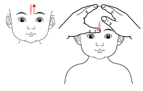 两眉毛中间至前发际成一条直线,两拇指自下而上交替直推30-50次。