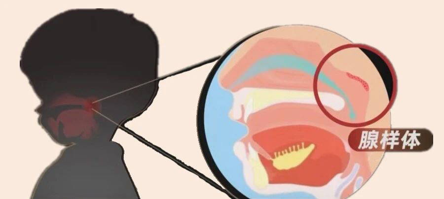 腺样体面容:由于长期张口呼吸,致使面骨发育发生障碍,颌骨变长,腭骨高拱,牙列不齐,上切牙突出,唇厚,缺乏表情,出现“腺样体面容”。