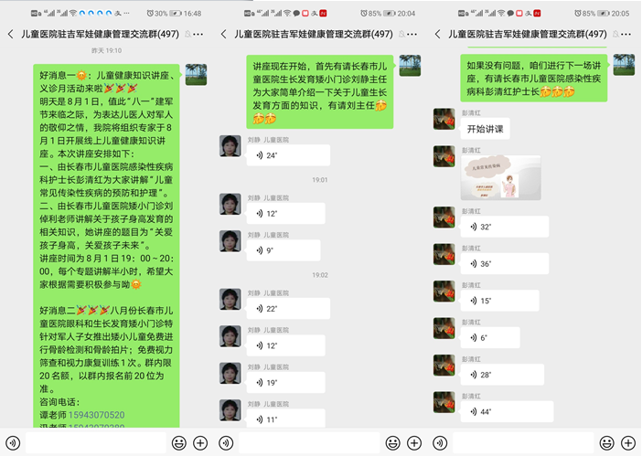 8月1日19时,在人们享受周末时光时,“儿童医院驻吉军娃健康管理交流群”中,交流互动,气氛相当热烈,一场“拥军优属线上健康知识讲座活动”开启了。