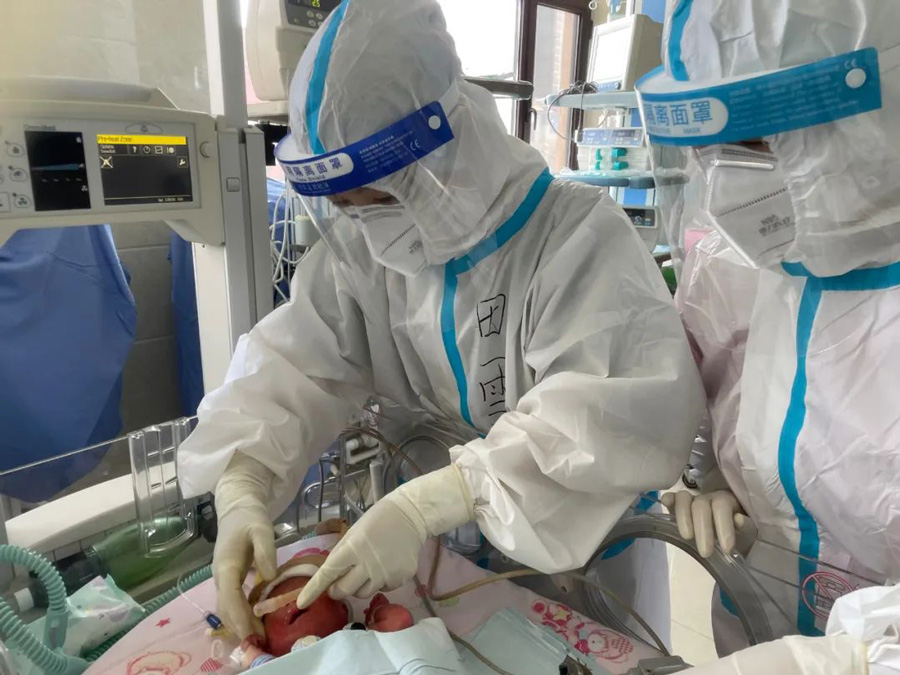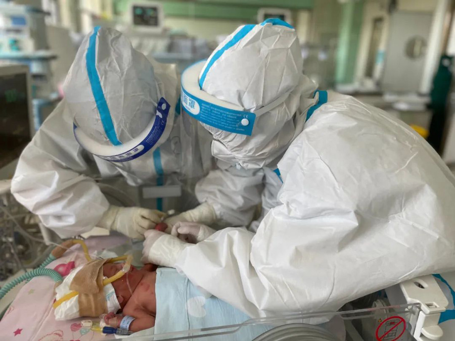 对于经验丰富的儿医团队,救治不是问题,最大的难题是大家都穿着三级防护服,戴着双层手套,隔着面屏。这样的“装备”,给护理带来了难度,尤其是给低体重的早产儿扎针,绝对是对技术的考验。即便如此,精锐的护理队员们依然“一针见血”,减轻了孩子的痛苦,而她们的护理动作也格外轻柔。