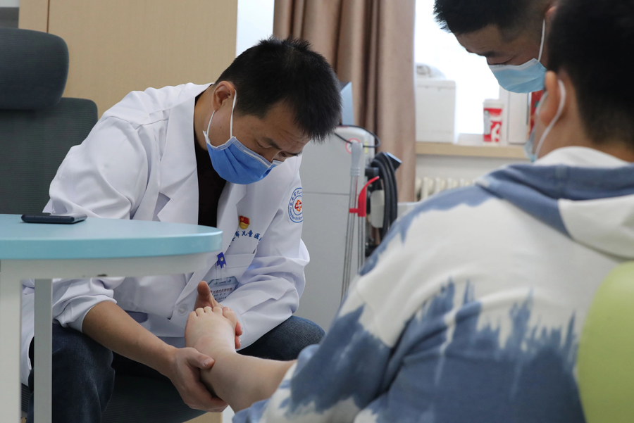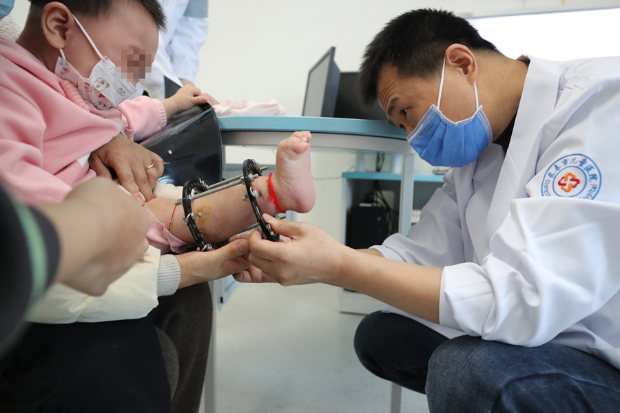 ▲ 李浩教授为8月18日先天性胫骨假关节手术患儿复查