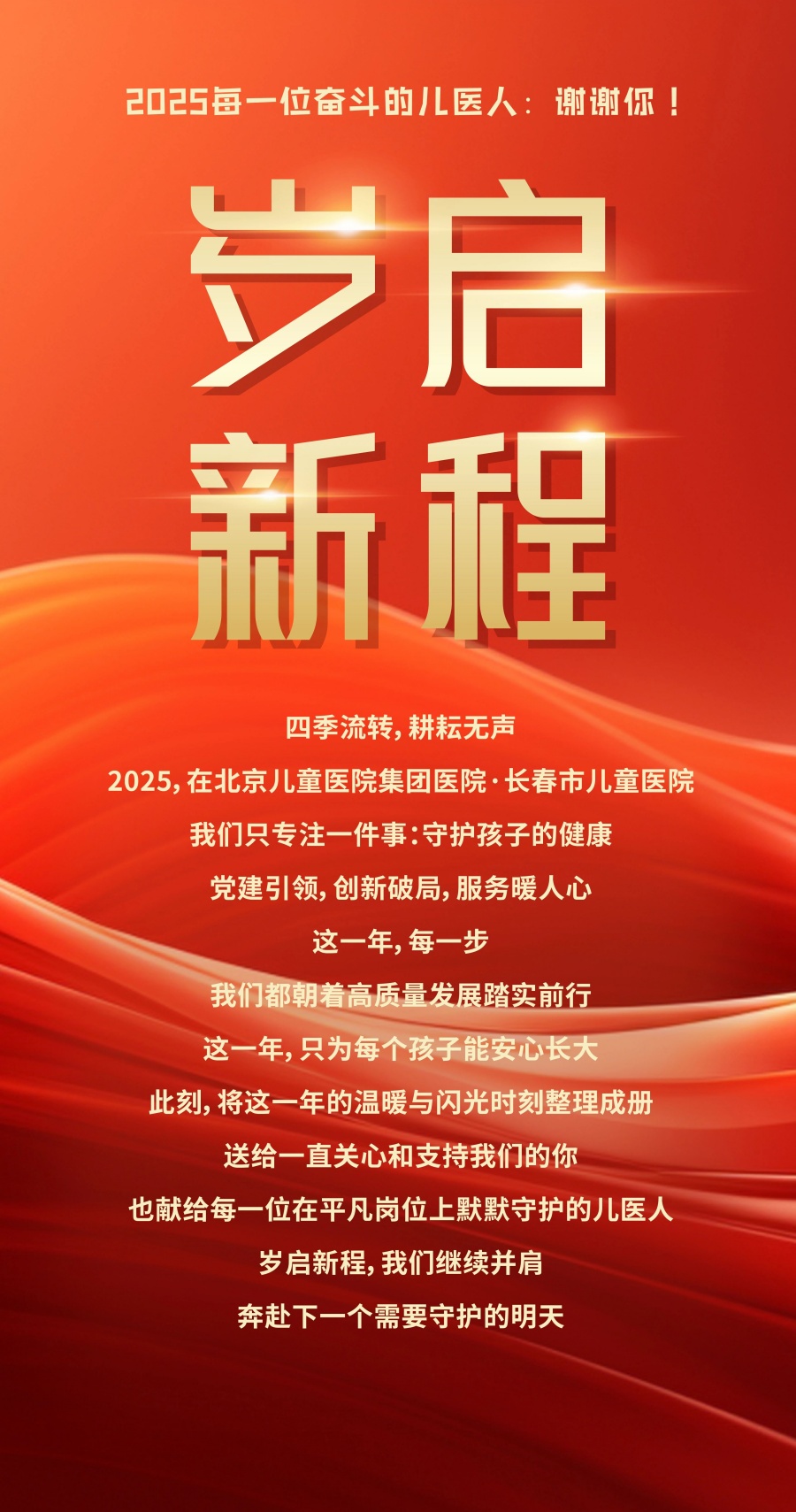 岁启新程!2025每一位奋斗的儿医人:谢谢你! 儿童医院 |2026-01-04 编辑:王凤娜初审:于 娜复审:王启明终审:齐 红 上一篇提前部署、深入排查,筑牢医院节日安全防线 下一篇你好2026!让爱与健康同行 返回列表 相关信息 献礼医师节,致敬忙碌在一线的儿医人! 2019-08-19 豆蔻女孩突然“瘫”了,这病6—12岁青少年多发 2021-04-19 结硕果 启新程丨a片网站 召开2024年度总结表彰大会 2025-01-18 凝聚共识谋发展,踔厉奋发启新程丨a片网站 召开中层干部座谈会 2025-01-17 同台共庆医师节,礼赞最美“儿医人” 2023-08-21