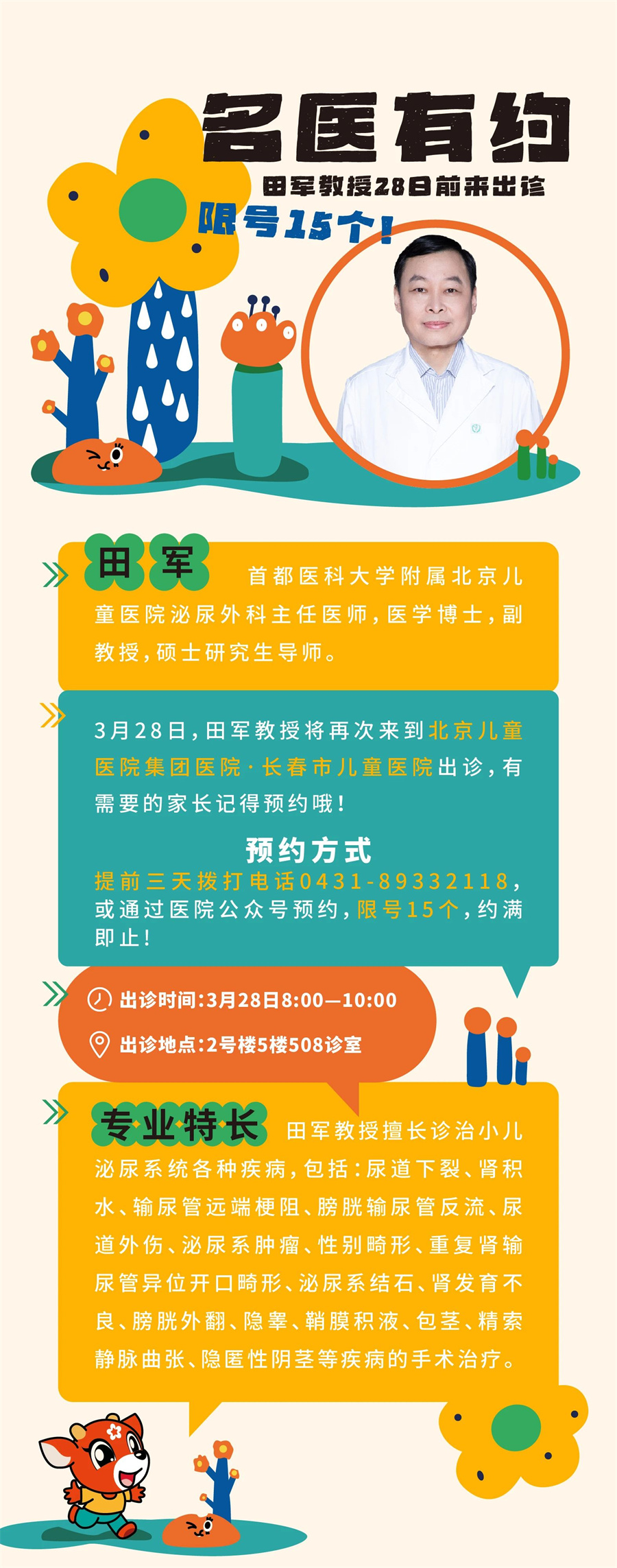 3月28日,北京儿童医院李浩、田军两位教授来长出诊! 儿童医院 |2025-03-21 13:57 上一篇让孩子睡个好觉,世界睡眠日惠民活动来啦! 下一篇3月28日,听儿医权威解答儿童中耳炎问题! 返回列表 相关信息 限号20个,北京儿童医院骨科专家李浩教授1月3日来长出诊,提前3天预约! 2024-12-26 限号15个!速约!北京儿童医院泌尿外科专家田军教授12月20日来长出诊 2024-12-12 出诊预告丨北京儿童医院骨科专家李浩教授24日来长出诊、手术 2024-05-17 定了!“北儿”骨科专家李浩教授12月15日来长出诊、手术 2023-12-08 新年健康礼!“北儿”骨科专家李浩教授1月5日来长出诊、手术 2024-01-01