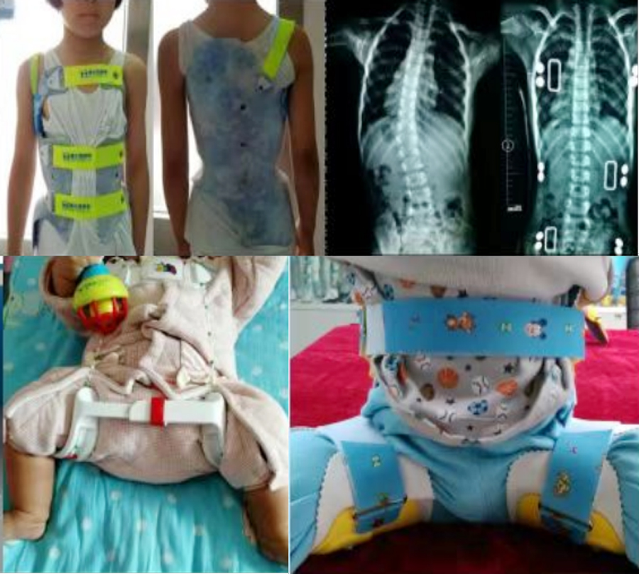 通过支具保守治疗青少年脊柱侧弯(上图)及早期髋关节发育不良和髋关节脱位(下图)。