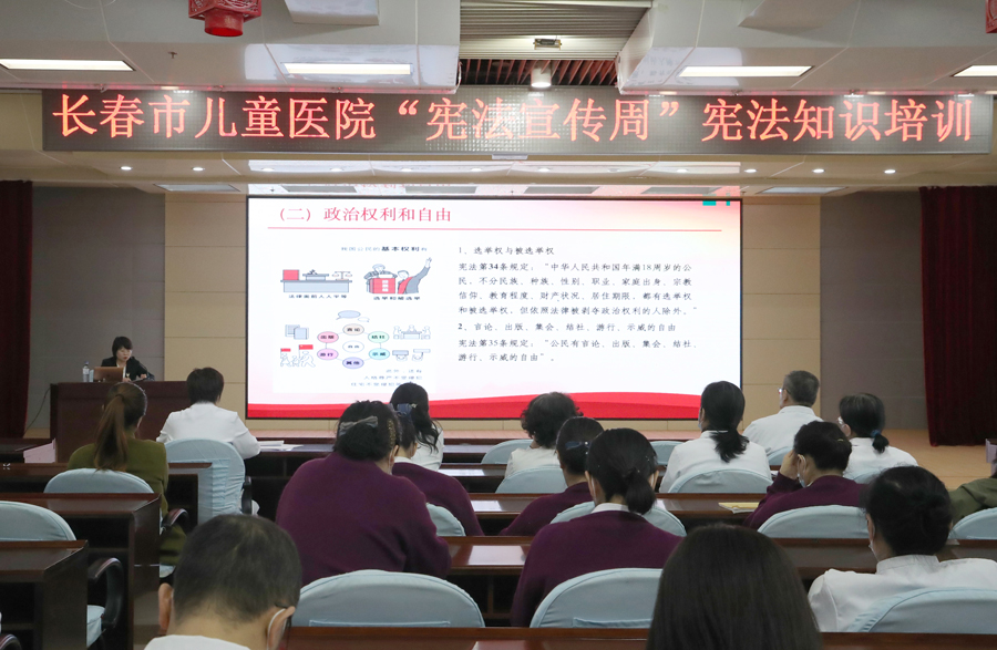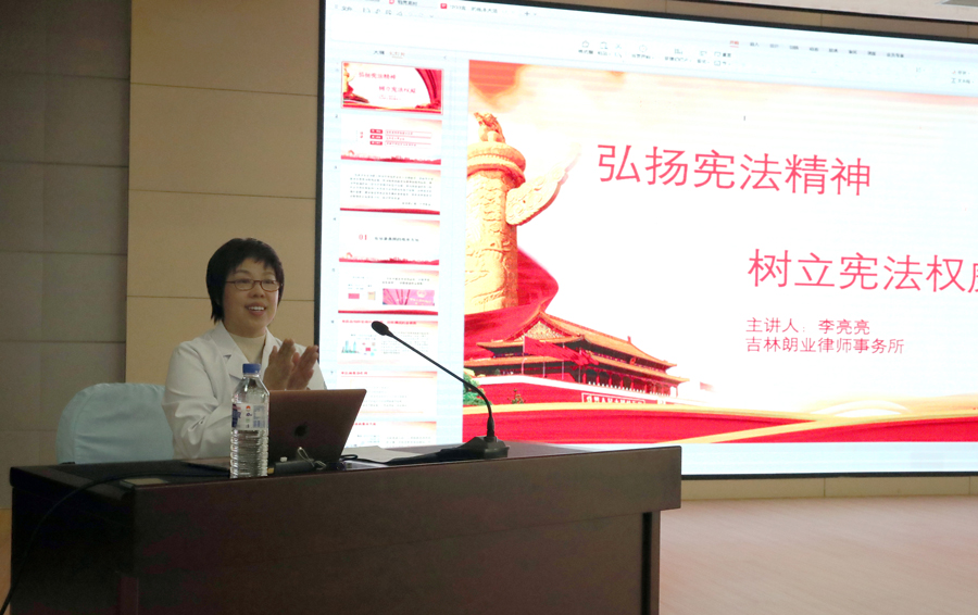12月12日,医院党委邀请吉林朗业律师事务所执业律师李亮亮为全院职工做宪法知识培训。医院党委副书记齐红、副院长杨光及中层干部、职工代表参加。培训中,李亮亮律师以《弘扬宪法精神和树立宪法权威》为题,围绕宪法是我国的根本大法、宪法的主要内容和把遵守宪法作为自觉行动三个方面进行讲解。通过培训,干部职工对以宪法为核心的社会主义法律体系有了进一步认识,增强了知法、懂法、守法的思想性和自觉性,学法热情空前高涨。大家纷纷表示,在今后的工作中要继续加强自身法律知识学习,坚定信念,忠实履职,进一步提高医疗质量和服务水平,促进医患和谐发展。