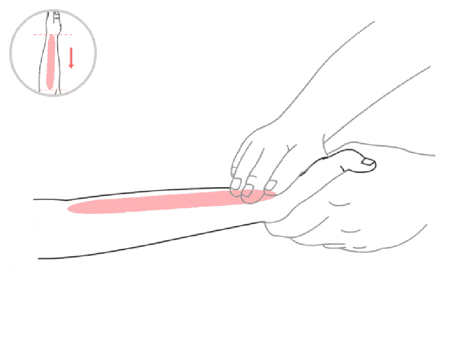 操作:一手握持小儿手部,另一手以食、中指面自腕横纹推向肘横纹1-3分钟。