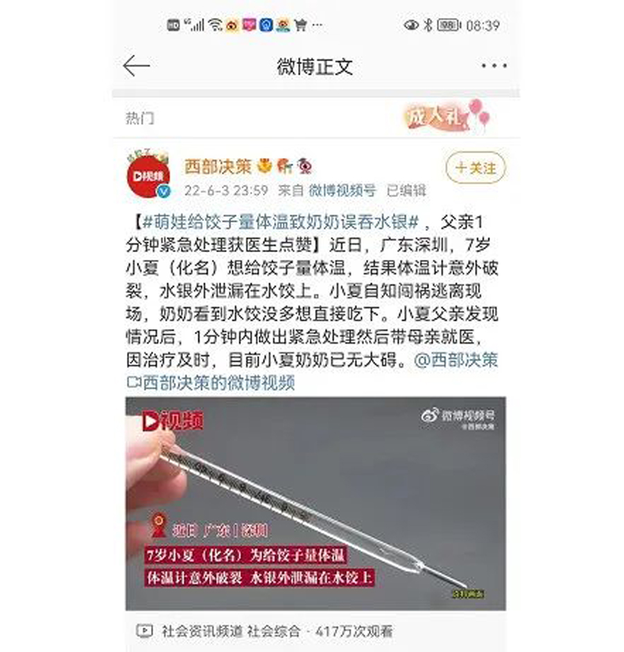 6月初,出现在微博热搜的这则事件引起很多人的关注。水银温度计对于每个有宝宝的家庭来说,再平常不过了。水银有毒,一旦泄漏或被误服,正确处置非常关键。在此,a片网站 内镜中心副主任边鹏教您正确处置方法,要仔细看哦!
