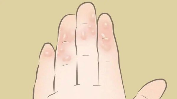 主要临床表现:分散或者成群发生于手指侧缘、手掌和足底,瘙痒明显的深在水疱,干涸后形成脱皮鳞屑。