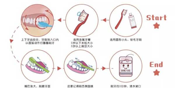 孩子2岁左右时,家长要教其学习刷牙,采用“圆弧刷牙法”。选择大小适宜的儿童牙刷,每2~3个月更换一次。每天早晚刷牙,每次刷牙时间不少于2分钟,晚上睡前刷牙更重要。