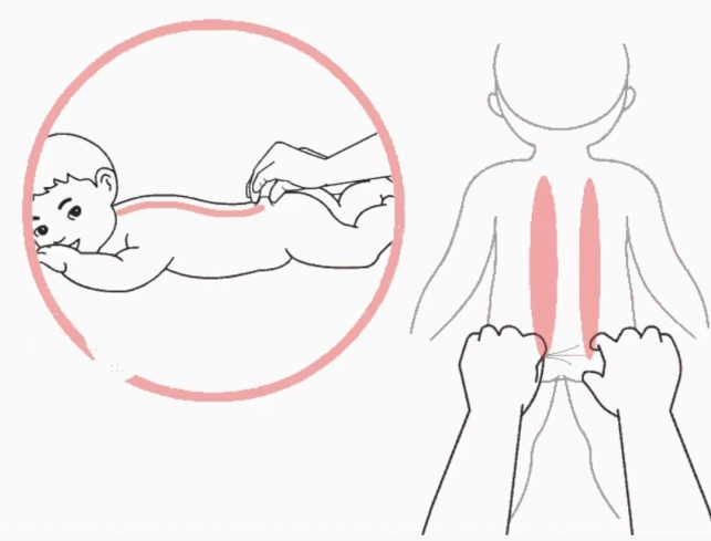 操作:以拇指与食中两指对称用力,自龟尾开始,双手一紧一松交替向上挤捏至第一胸椎处,反复5~7遍。