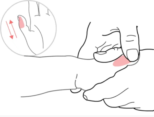 操作:将小儿拇指屈曲,以拇指端循小儿拇指桡侧缘,由指尖向指根方向直推300次。