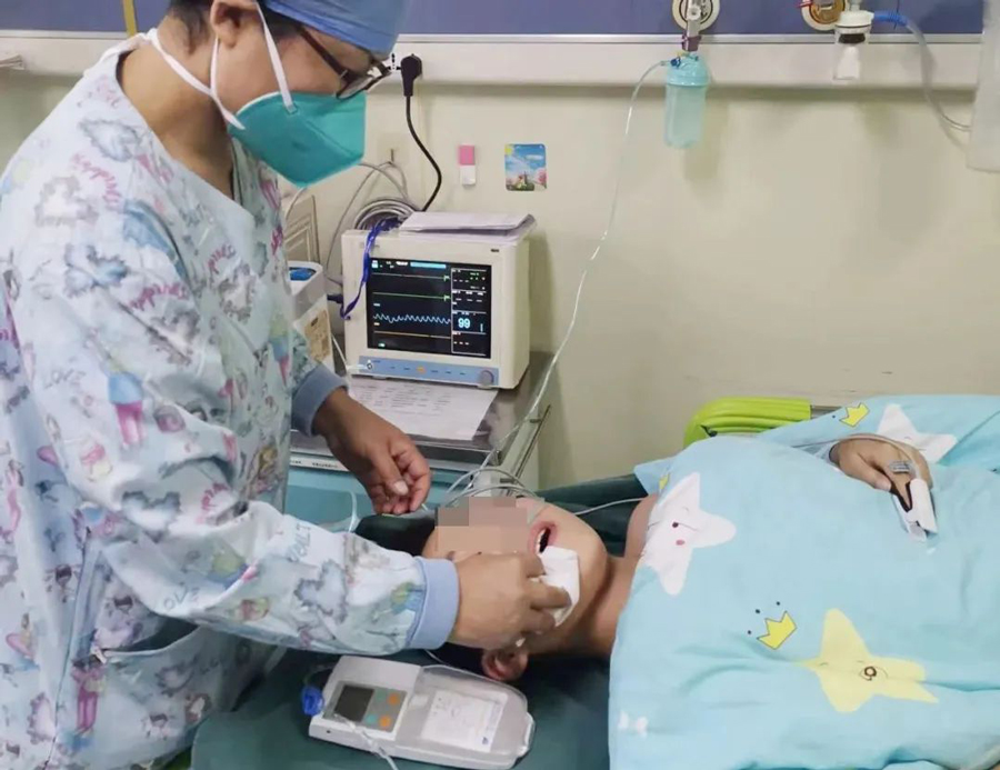 为防止患儿术中低体温的出现,在麻醉医生的带动下,儿医人从各环节着手,采取诸多保温措施。不同于成人微凉的手术室,儿童的手术室温度正常保持在24~26℃。新生儿手术时,均采用保温箱转运,手术室温也会调至26~27℃。手术床上铺着温度可控的加温床垫或水毯,患儿盖着婴儿棉做的小被子;术中的输液或冲洗液均经过输液加温仪加热,确保输液或体腔冲洗时不会对患儿体温造成太大影响;术后,医护人员还会为患儿吹暖风,确保敷料温度。